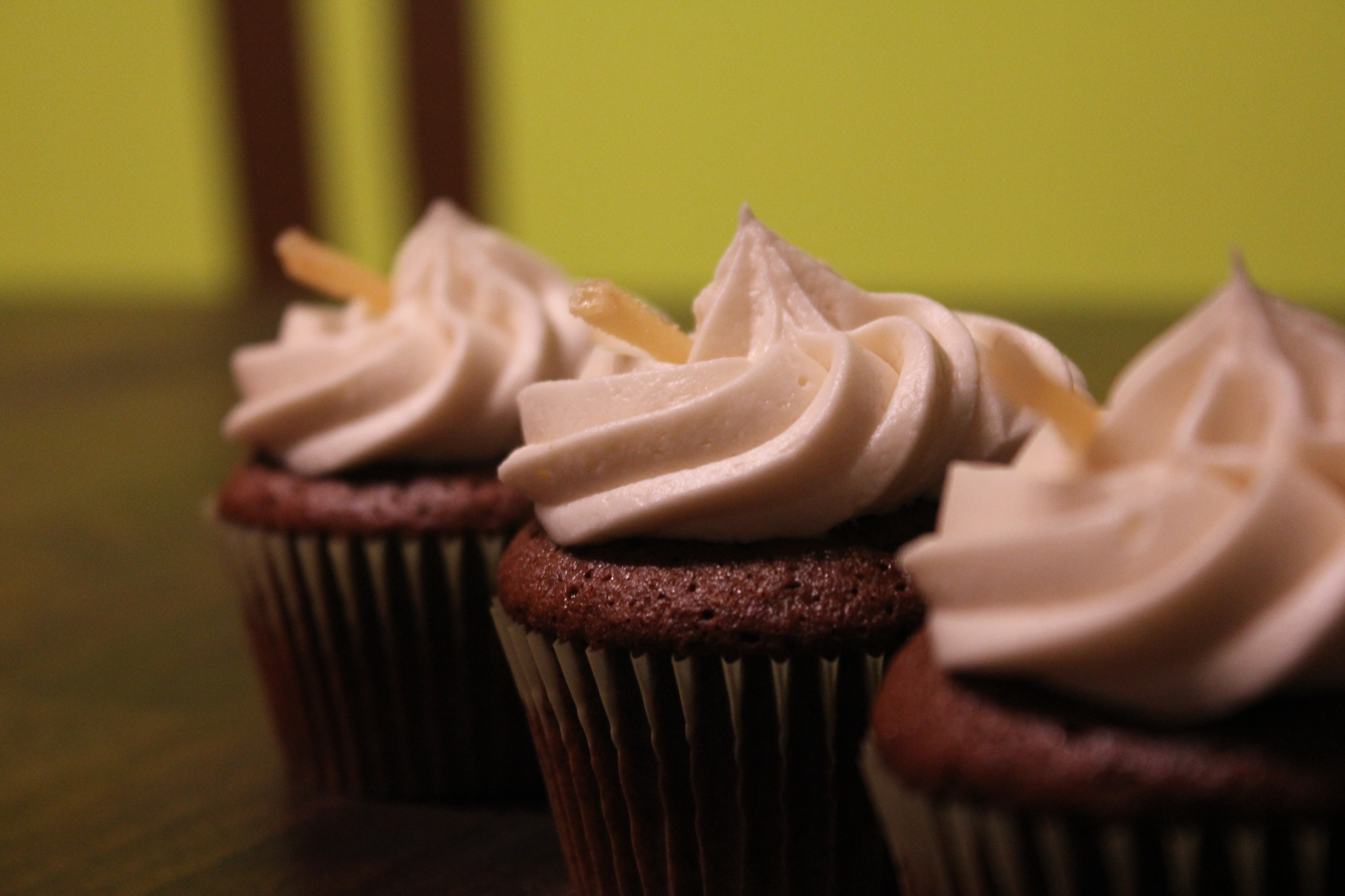 Let cupcakes cool completely before frosting. Garnish with slices of candied ginger. Eat. Can be refrigerated up to 3 days.