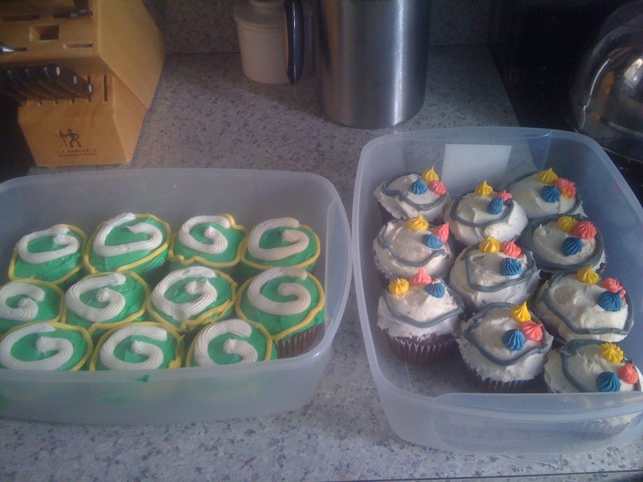 When I brought these cupcakes to a party, there was some debate over whether you wanted to eat the cupcake of the team that you were rooting for (in celebration) or of their opponent (as in, you’ll devour the competition). In any case, there were a lot more Steelers cupcakes left over at the game’s end. by Erin