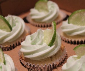 Let cupcakes cool completely before frosting. If garnishing, cut lime into very thin slices, about 1/8 inch thick. cut each slice into quarters. Pat dry with paper towels and place on frosting.