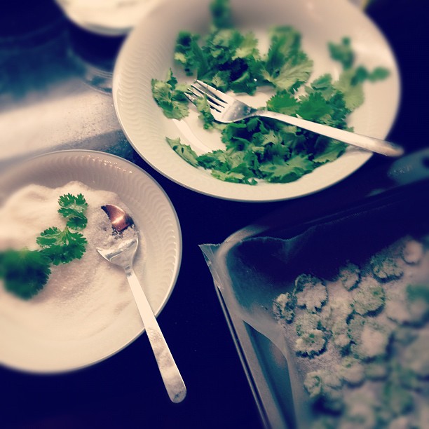 Last night, I crystallized cilantro leaves for garnish. It’s a bit time consuming, so I called my mother and over analyzed all of my recent life choices while I was at it. Revelations: my mother is concerned about my display of typical piscean tendencies and there is a pleasing monotony to crystallizing.