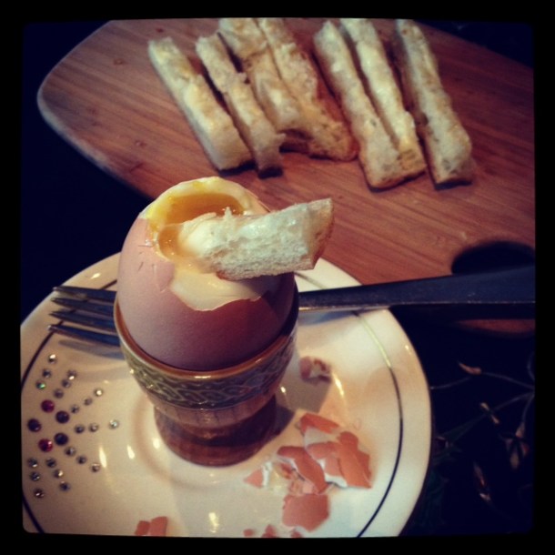 It looks like brunch, but it’s actually karma.  See, the only person who ever made me soft boiled eggs with buttery toast strips to dip in it, (eggs and soldiers), was my grandmother.   A couple things have put me out to sea this week, but I haven’t dealt with them because I spent my free time helping friends with a super cool project.  It was heaps of fun, but by Sunday, I needed a completely supportive/full of truisms/reminder of the important things in life hug from my g-ma to re-balance my psyche.  But she’s drinking campari in the afterlife, which is cool for her, but left me a little wistful.  Then I went to brunch and my friend had made soft boiled eggs with buttery toast strips.  It was a hug from the universe in an egg cup and the nicest thing ever.  Psyche: re-balanced.