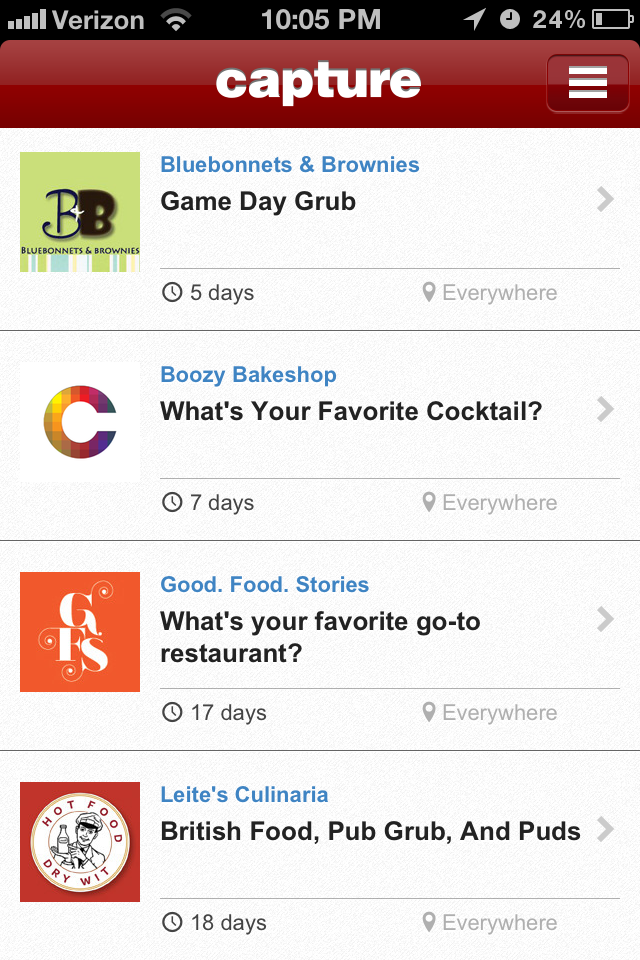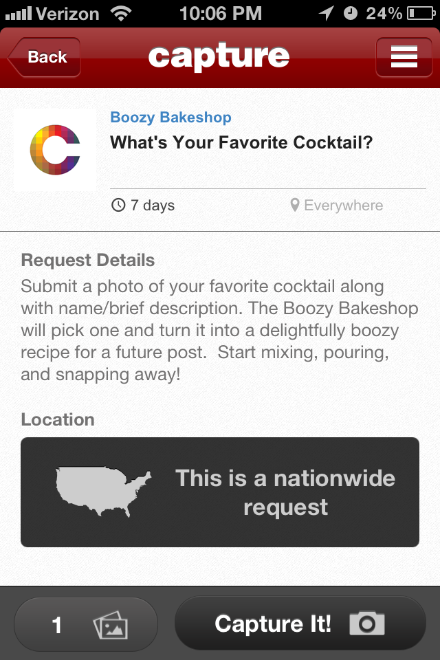 I’m testing out a new iPhone app called Capture. What’s cool about it is I can ask you for specific picture of something we both like, for example, booze, and you can share your photos with me to use on Boozy Bakeshop. So this is what I need you to do: