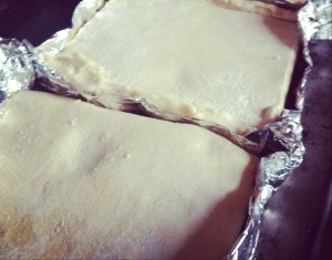 Because you’re at a boy’s house, and he probably doesnt own a pie tin, fold a large sheet of aluminium foil into a 5″x6” rectangle with 1” high sides, smooshing the corners together to seal them shut (you don;t want that bourbony goodness to leak out!. Repeat to make a second “tin”. (I like to double the sheet of foil and fold up the side 3 times, or you know use 2 small 5” pie tins. You can also make six tiny pies in a muffin tin, or one 9” pie in a regular tin – the possibilities are endless! I was at a boy’s house so I made foil rectangles with sides.)