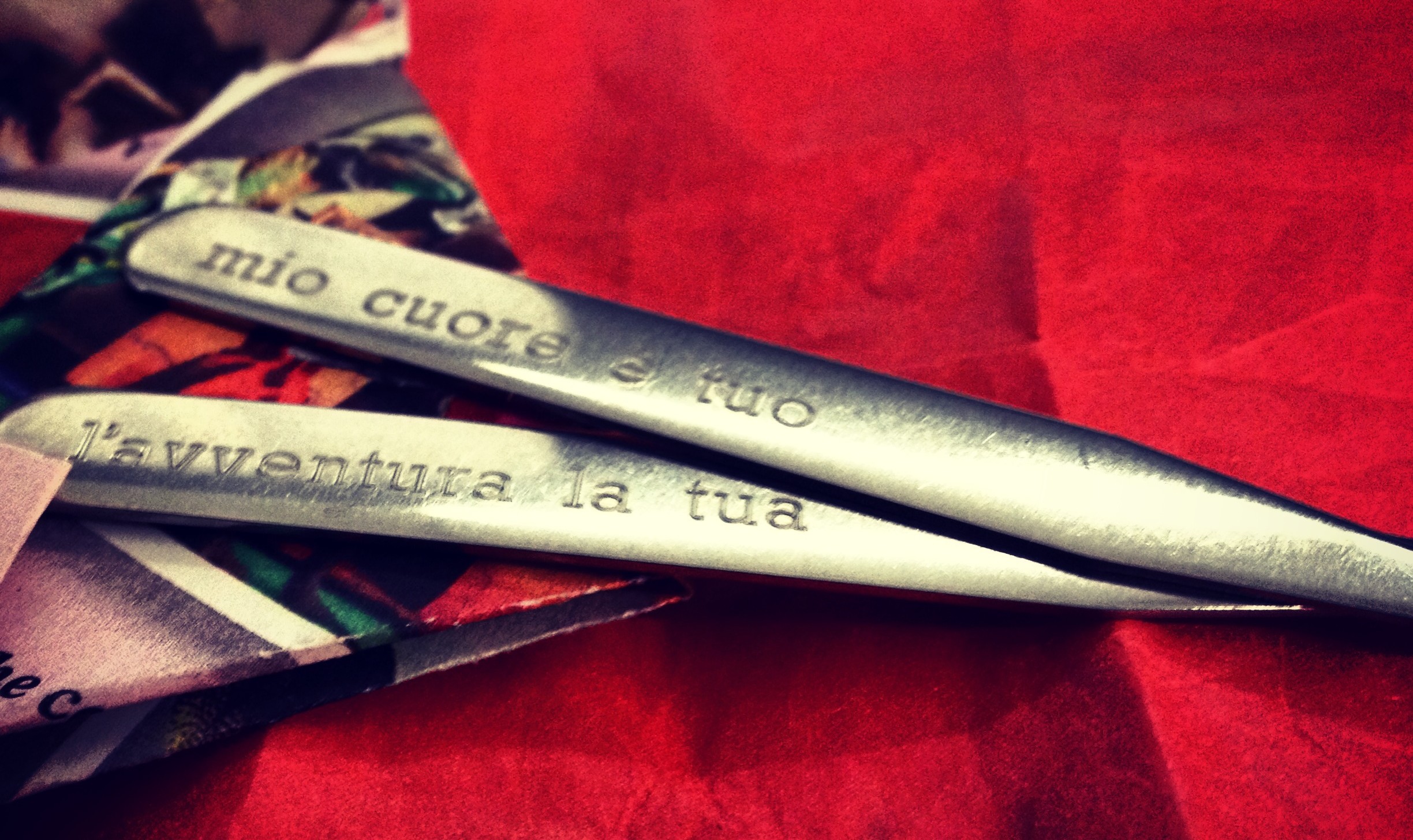 You make him dinner: black sea bass with hints of the land he’s leaving for, and apple pie in the hopes that fate brings him back home. You write the words you want to say, but hide them on collar stays, close to his carotid, not his heart, and out of sight. You engrave smushy sentimentality on one side, truthful reality on the other: mio cuore e tuo, l’avventura la tua.