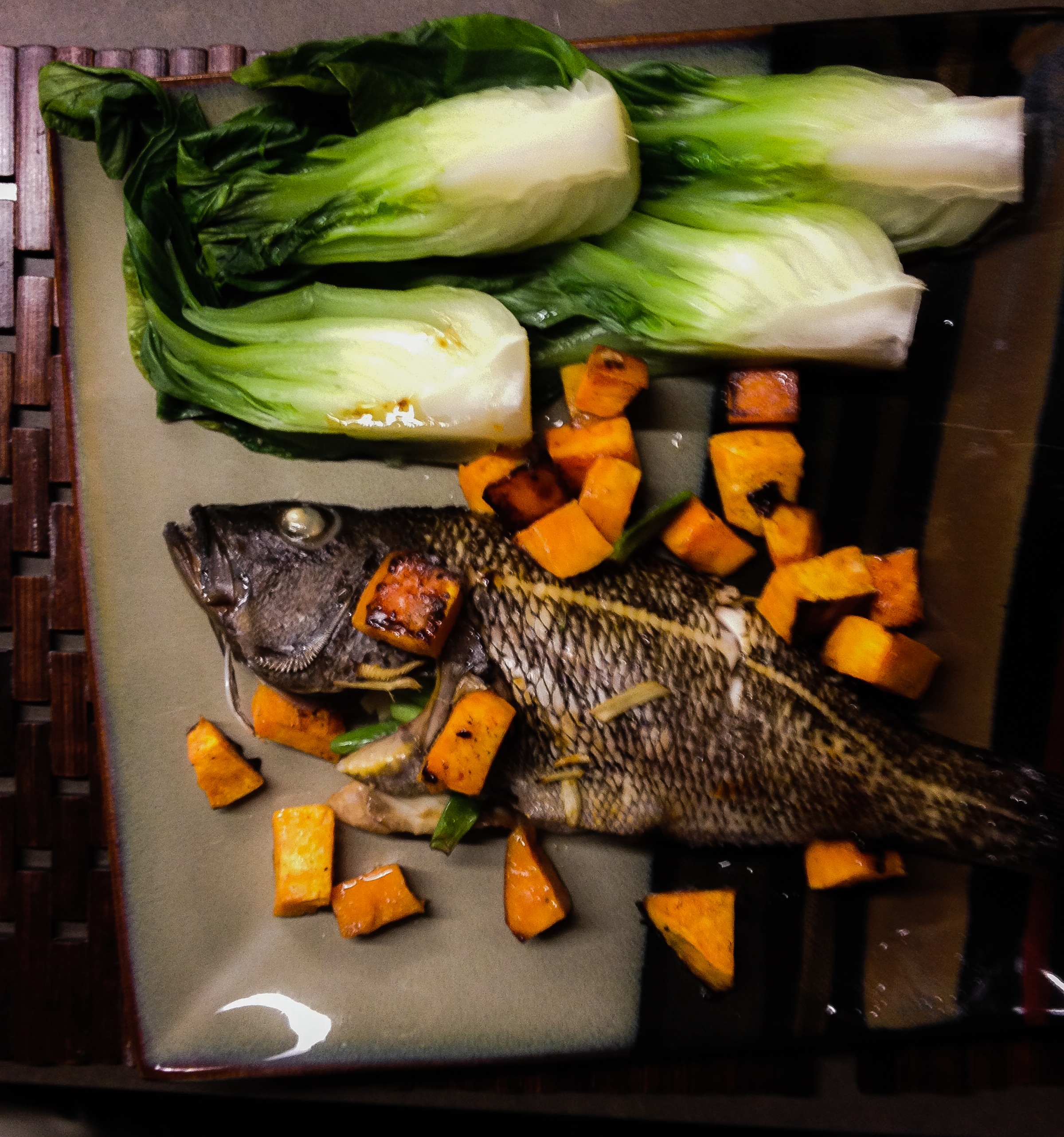 black sea bass with scallion ginger bourbon glaze, toasted sesame yams and bok choy, & bourbon apple pie