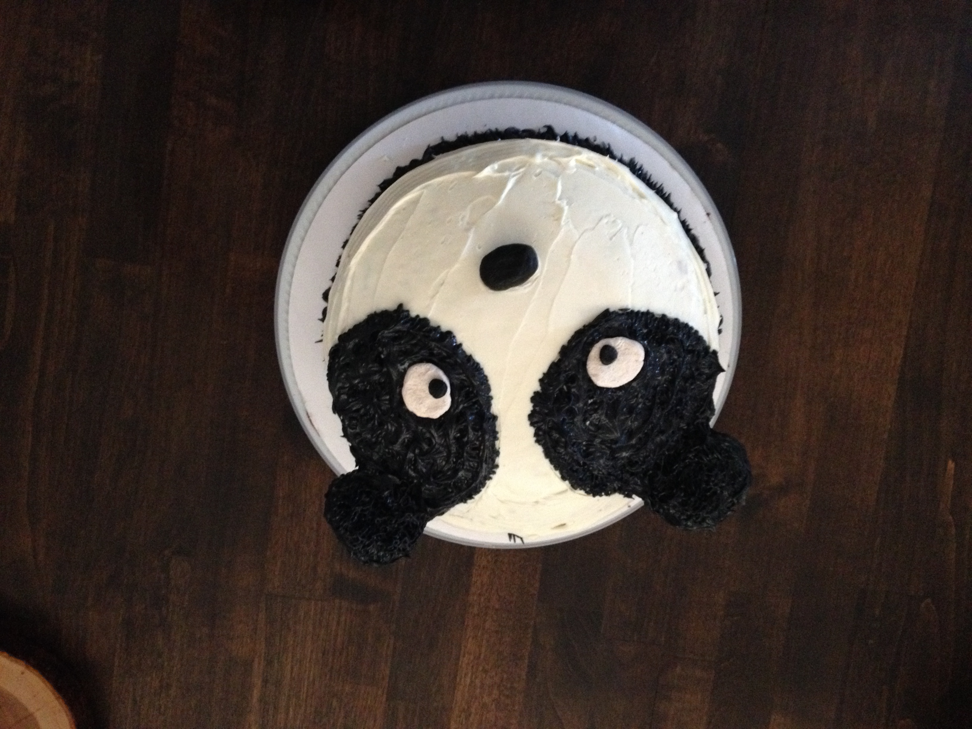 Reserve about 2/3 cup frosting and dye with black food coloring. Frost cake all over with vanilla frosting. Return to fridge. Color a small ball of marzipan with white food coloring and shape into to small disks for whites of eyes. Color a large ball of marzipan with black food coloring and shape nose, two pupils and two ears. Using an toothpick or knife edge, outline panda eyes. Insert ears into side of cake with toothpicks. Place black frosting in a pastry bag fitted with a multi-tip. Fill outlined eyes area and cover ears with “fur”. Place nose, whites of eyes and pupils.