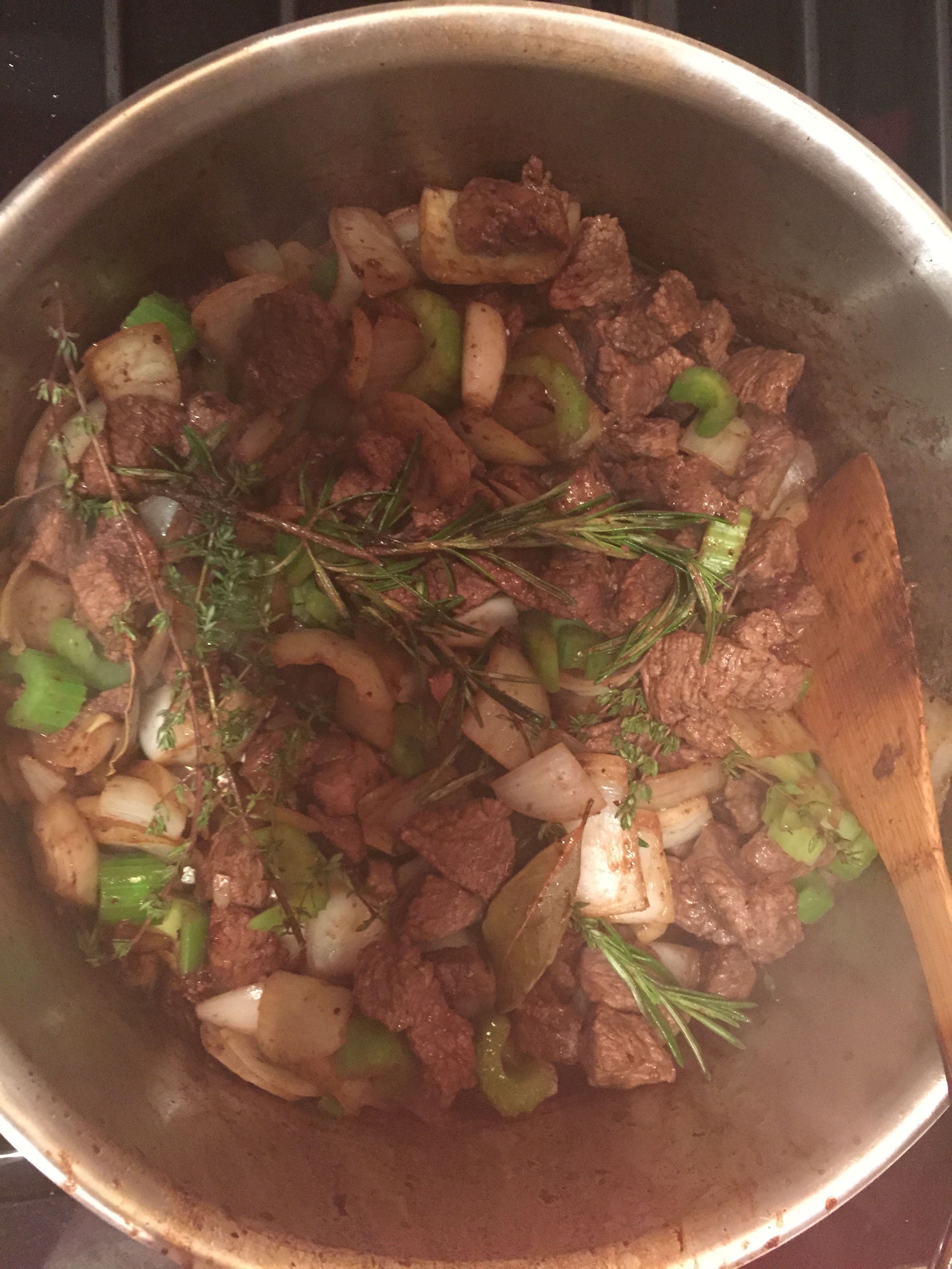 In a large pot, heat oil over medium high heat. Working in batches so as not to crowd the pan, (crowding leads to steaming, you want the edges to caramelize to a rich brown – takes about 2-5 minutes), brown meat, seasoning liberally with salt and pepper. When meat is browned, put all of it back in the pot with the bay leaves, rosemary, thyme, garlic, onions, and celery, stirring and scraping up all of the browned bits on the bottom of the pan. When onions and celery have softened, about 5 minutes, add wine and tomato paste. Return to a boil. Add water and carrots, cover and simmer for an hour on low to medium low until beef chunks are fork tender, (check periodically to make sure there is liquid in the pot and it is bubbling away). Uncover and stir in parsley. Add salt and pepper to taste. Simmer for 5 minutes more.